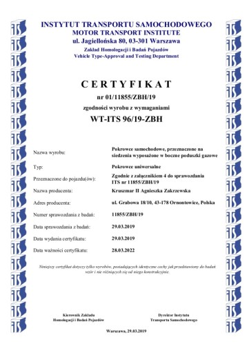 - Nie blokują wystrzału poduszek, co pozwala na bezpieczne użytkowanie pokrowców! Potwierdza to certyfikat ITS!