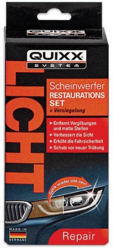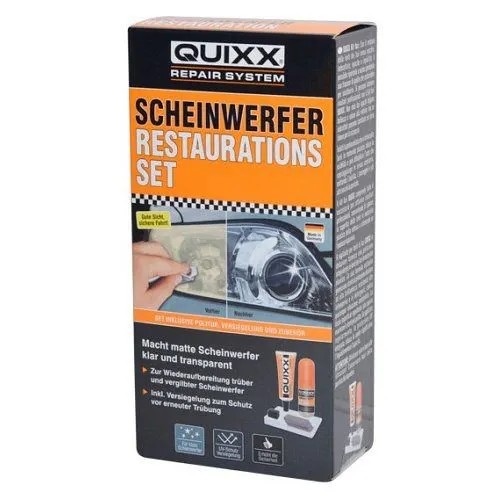 Zestaw do renowacji reflektorów firmy QUIXX usuwa zażółcenia, matowe obszary, lekkie zadrapania i zapewnia przejrzyste soczewki reflektorów. Zwiększa bezpieczeństwo jazdy dzięki doskonałemu oświetleniu, a tym samym umożliwia lepsze widzenie i bycie widzianym. Poprawia wygląd, a tym samym zapewnia utrzymanie wartości.