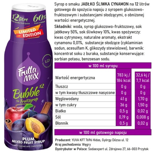Syrop do Soda Stream o smaku Jabłko Śliwka Cynamon 500 ml !