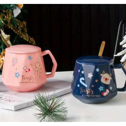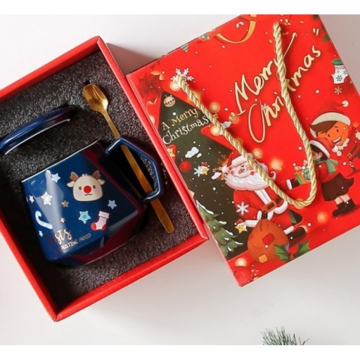KUBEK CERAMICZNY NIEBIESKI z motywem świątecznymzestaw z pokrywką i łyżeczką