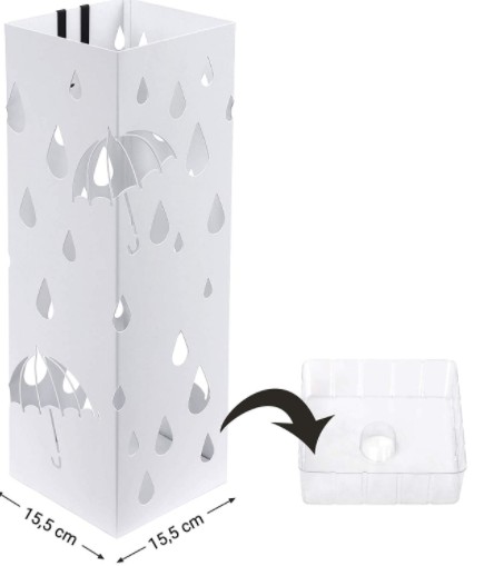Dodatkowe elementy – w zestawie dostajesz plastikową tacę ociekową, która zapobiega wypływaniu wody, oraz dwa haczyki do wieszania złożonych parasoli