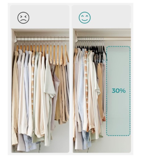 W porównaniu do zwykłych wieszaków wieszak na ubrania zajmuje mniej miejsca (tylko 0,5 cm grubości). Dzięki dużej nośności możesz powiesić kurtkę razem z dopasowanymi spodniami. Stwarza to więcej miejsca do przechowywania w szafie.