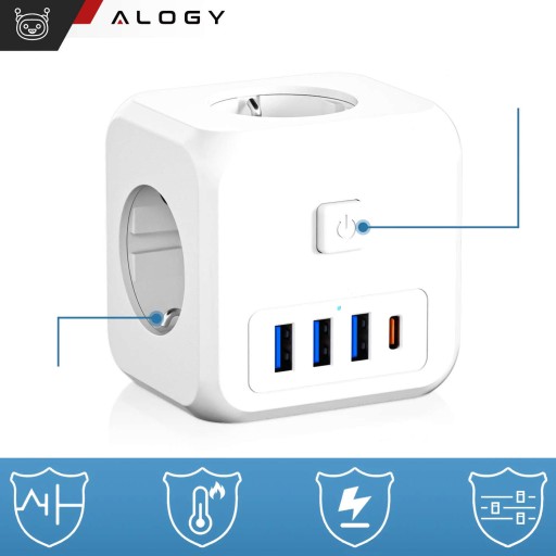 Rozdzielacz gniazda sieciowego Alogy posiada trzy standardowe gniazda sieciowe typu PL/EU, trzy porty USB-A oraz jeden port USB-C. Główne funkcje obejmują rozdzielanie zasilania do różnych urządzeń elektrycznych oraz ładowanie urządzeń mobilnych bez potrzeby osobnych ładowarek.