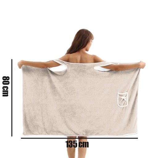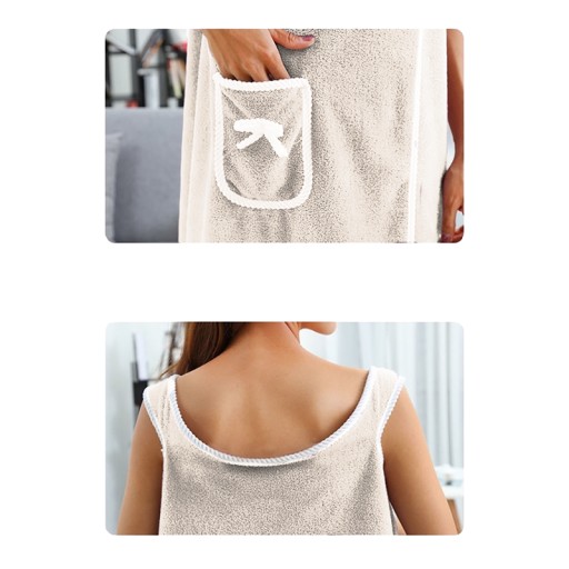 Wygodny kobiecy ręcznik bez rękawów zapinany jest na plastikowe zatrzaski. Nie musisz martwić się o zacinający się suwak czy włosy wplątane w zamek błyskawiczny.