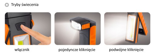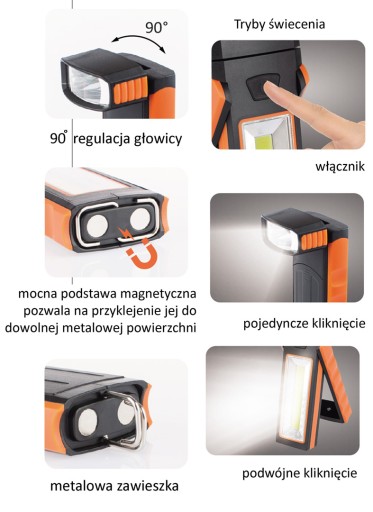 Latarka posiada dwa otwierane haczyki dzięki którym możesz ją również powiesić. Dodatkowo w obudowie znajdują się dwa uchwyty magnetyczne.