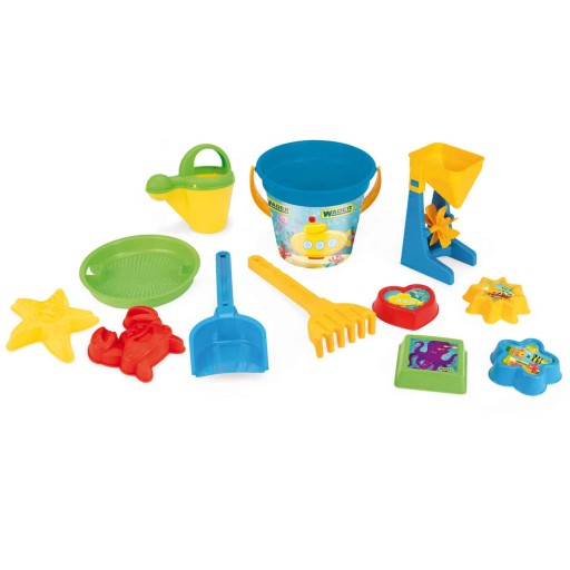 ✅zestaw zawiera: łopatkę, grabki, 6 foremek, konewkę o pojemności 0,5 l, młynek do piasku, sitko i wiaderko o pojemności 3,4 l