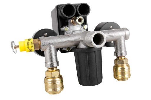 Wyłącznik ciśnieniowy (presostat) z reduktorem, kolektorem, dwoma szybkozłączkami i manometrami przeznaczony do kompresorów różnych producentów zasilanych napięciem 230V. Oferowany wyłącznik to uniwersalna część zamienna przeznaczona do kompresorów głównie z mniejszymi zbiornikami (24, 50, 60, 75l).