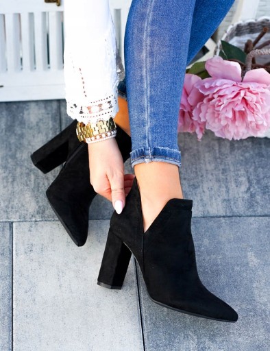 Eleganckie czarne botki damskie. Buty w całości wykonane z mięciutkiej eco skóry zamszowej. Stabilny, szeroki obcas słupek zapewni komfort użytkowania.Niebanalny look obuwiu nadaje wycięcie na kostce. Cholewka wzdłuż krawędzi posiada subtelny ażurowy print