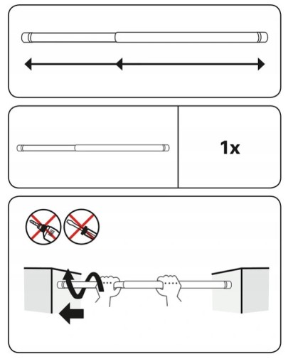 ✅Drążek należy ustawić równo a potem trzeba rozkręcić tak aby napierał równomiernie z obu stron. Na końcach posiada gumowe nóżki dzięki którym nie uszkodzi ścian. Metoda jest prosta i szybka.