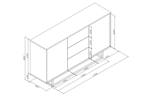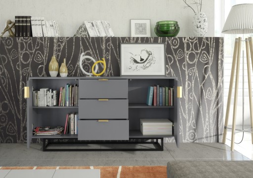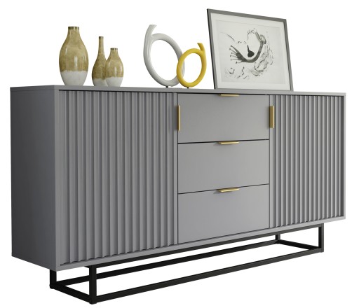 Zachwycająca komoda w stylu glamour, której konstrukcja wykonana jest z wysokiej jakości płyty laminowanej o grubości 15 mm gwarantującej wytrzymałość. Mebel posiada dwoje drzwi (ze swojej lewej i prawej strony). Niezwykle modne, ryflowane fronty drzwiczek w połączniu z uchwytami w złotym kolorze z całą pewnością wprowadzą do wnętrza odrobinę luksusu. W centralnej części szafka wyposażona została w 3 szuflady. Cały mebel posadowiony został na metalowej ramie w kolorze czarnym, co zdecydowanie nadaje mu niebywałego charakteru. Oryginalny design mebla sprawia, że zachwyci on niemal każdego gościa Twojego domu.