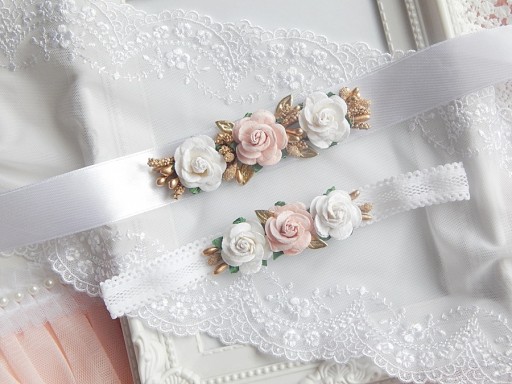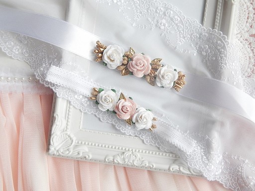 Różany pasek do sukienki wykonany z wstążki satynowej w kolorze białym o długości ok 120cm. zdobiony pięknymi kwiatami.