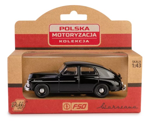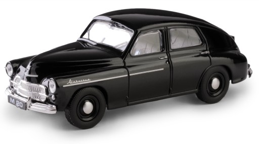 Metalowy, legendarny i rewelacyjny model samochodu Warszawa M-20, produkowanego w czasach PRL. Model wykonany w skali 1:43, jako auto osobowe w kolorze czarnym. Pierwsza Warszawa M-20, która została zmontowana z części sprowadzonych z ZSRR, zjechała z taśmy montażowej 6 listopada 1951 roku. Początkowe plany zakładały produkcję na poziomie 25 000 sztuk rocznie, do końca roku 1951 powstało jednak jedynie 75 egzemplarzy. Dopiero w 1953 roku zmontowano silnik M-20 w całości z części polskich i rozpoczęto eksport do Chin, Rumunii, Albanii oraz Bułgarii. W oparciu o podzespoły dedykowane dla Warszawy skonstruowano także samochody dostawcze: Żuka, Nysę oraz Tarpana. Samochody były wykorzystywane w różnych formacjach. Znakomity upominek na każdą okazję, zarówno dla początkujących jak i zaawansowanych kolekcjonerów i pasjonatów motoryzacji.
