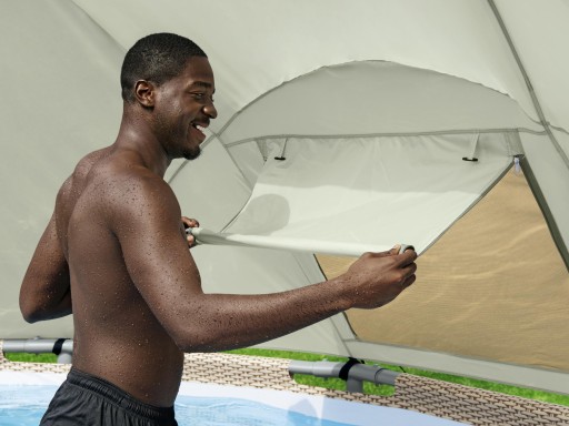 Daszek Bestway wykonany jest z materiału typu poliester, a stelaż z włókna szklanego o średnicy ok. 8 mm. Daszek należy samodzielnie zmontować i za pomocą klamerek doczepić w odpowiednie miejsca na ściance basenu. Montaż jest łatwy i szybki, nie wymaga zastosowania dodatkowych narzędzi. Czas montażu to kilka minut.