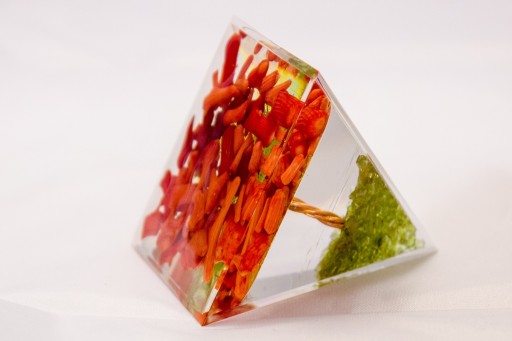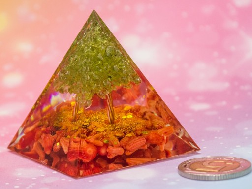 Piramidka Orgonitowa – odpromiennik z pięknym intensywnie czerwonym Koralem i Oliwinem - oddziaływanie energetyczne na wszystkie 7 czakr u człowieka, a także przepiękny wygląd i wspaniałe kolory minerałów.