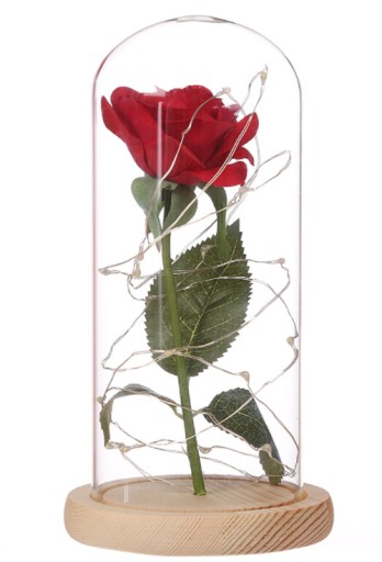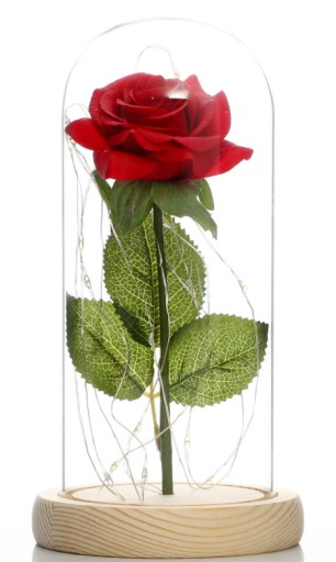 Niezwykła róża, symbol miłości, zachowuje swoją piękność na zawsze. Umieszczona pod delikatną kopułą ze szkła, jej wdzięk nigdy nie przeminie. Kiedy jest ciemno rozświetlają ją światełka LED, które otaczają ją.