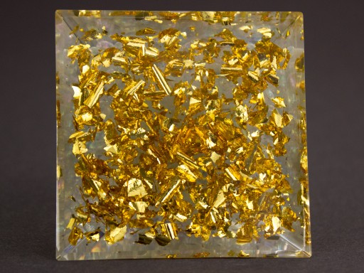 Na spodzie piramidki znajduje się warstwa pięknie błyszczącej złotej folii, która symbolizuje światło, bogactwo i wyjątkowość. To solidne podstawy, na których opiera się cała energia tej piramidki, tworząc harmonijny układ elementów.