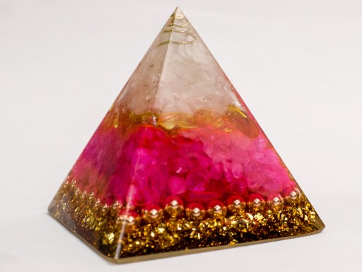 Piramidka Orgonitowa – Relacje z samym sobą, pomoc przy bezsenności, pokój ducha, odstresowanie, sprzyja przedsiębiorczości. Piękna dekoracja z Kryształem, Cytrynem i Różowym Kryształem, żywicą oraz pięknymi perełkami przy podstawie.