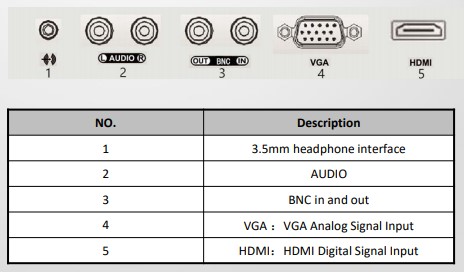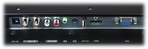- Interfejsy HDMI, D-Sub (VGA), Wejście audio jack 3.5 mm, 2 wejścia audio RCA (L, R), We/Wy BNC do podłączenia sygnału CVBS