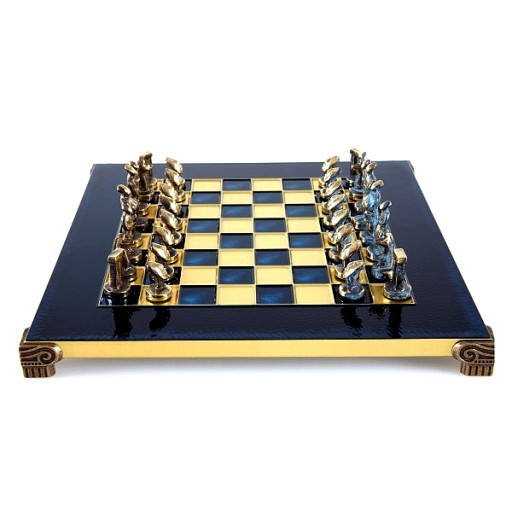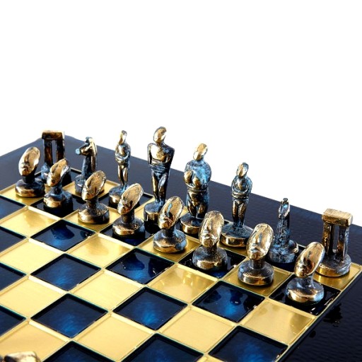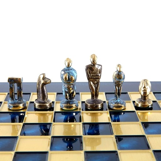 Ekskluzywne szachy metalowe Cycladic; 28x28cm, S22BKultura cykladzka to kultura epoki brązu, która występowała w trzecim i drugim tysiącleciu przed naszą erą głównie na wyspach archipelagu Cyklady. Jej głównymi ośrodkami były: Syros (obecnie Siros), Naksos i Milos.Z wczesnym rozwojem sztuki tej kultury, do około 1900 p.n.e., związane są znaleziska małych (przeciętnie ok. 0,2-0,5 m wysokości) figurek wykonanych najczęściej z marmuru, zwanych obecnie idolami cykladzkimi. Nasze szachy są inspirowane takimi figurkami. Małe figurki wkładane były do grobów, mogły więc mieć związek z obrzędami pogrzebowymi. Przypuszcza się, że figury większych rozmiarów były umieszczane w miejscach kultu. Uważa się również, że przynajmniej niektóre z tworzonych figurek stanowiły wyobrażenia bóstw.Szachy i szachownica wykonane zostały z troską o zachowanie najwyższej jakości.Waga kompletu:3,2kg; Wysokość króla 5,4cm. Figury wykonane ze stopu cynku. Kolory: brązowe / błękitneSzachownica 28x28cm, mosiądz. Kolory: błękitno - żółte; ręcznie malowaneWykończenie ręczne najwyższej klasy.Szachy zapakowane są w piękne, luksusowe, drewniane pudło. W środku starannie wykonana wypraska do układania i bezpiecznego przechowywania figur.Produkt w najwyższym stopniu ekskluzywny, przepiękny prezent. Prezent dla szachisty, piękny element dekoracyjny. Wyprodukowane w Grecji przez renomowaną firmę Manopoulos z kilkudziesięcioletnią tradycją produkcji.Szachy Manopoulos rozpoznawane są na całym świecie jako małe dzieła sztuki.Polecamy!