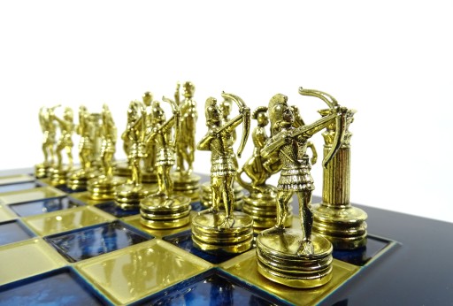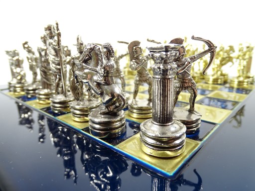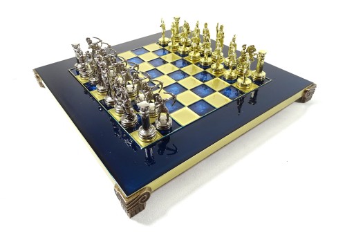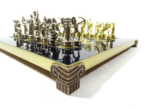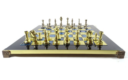 Ekskluzywne, duże klasyczne szachy metalowe Stauton S34; 36x36cmSir Howard Staunton był uważany za jednego z najlepszych graczy w szachy na świecie w XIXw. Nieoficjalny mistrz świata w latach 1843–1851.Zajmował się nie tylko praktyczną grą w szachy. Był również organizatorem życia szachoweg, dziennikarzem i autorem podręczników szachowych, uznanym teoretykiem gry szachowej i twórcą przepisów w zakresie samej gry, jak i sposobu jej rozgrywania. Od 1845 roku przez następne 29 lat redagował szachową kolumnę w londyńskiej gazecie Illustrated London News, stając się najbardziej wpływowym szachowym publicystą na świecie. W 1847 roku wydał Chess-Player's Handbook (Podręcznik szachisty), najbardziej znaną z jego serii książek szachowych. W 1849 roku Staunton podpisał komplet bierek szachowych, zaprojektowany przez Nathaniela Cooka i wyprodukowany przez Johna Jaquesa. Bierki polecił w swojej gazecie szachowej. Ich kształt stał się najpopularniejszym wzorcem bierek szachowych na świecie, używanym do dziś na większości turniejów szachowych.Szachy i szachownica wykonane zostały z troską o zachowanie najwyższej jakości.Waga kompletu: 4,8kg; Wysokość króla 6,5 cm. Figury wykonane ze stopu cynku. Kolory: srebrzyse / złocisteSzachownica 36x36 cm, mosiądz. Kolory: błękitno - żółte; ręcznie malowaneWykończenie ręczne najwyższej klasy.Szachy zapakowane są w piękne, luksusowe, drewniane pudło. W środku starannie wykonana wypraska do układania i bezpiecznego przechowywania figur.Produkt w najwyższym stopniu ekskluzywny, przepiękny prezent. Prezent dla szachisty, piękny element dekoracyjny. Wyprodukowane w Grecji przez renomowaną firmę Manopoulos z kilkudziesięcioletnią tradycją produkcji.Szachy Manopoulos rozpoznawane są na całym świecie jako małe dzieła sztuki.Polecamy!