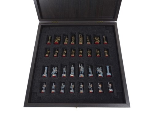 Ekskluzywne szachy mosiężne - okres grecko-rzymski S3BBLU 28x28cmSzachy te nawiązują do czasu wojen grecko - rzymskich z IIw. p.n.e.Rosnący w siłę Rzymianie pokonali Greków, ale jak mawiał Horacy: Zdobyta Grecja podbiła dzikich zwyciezców. Mowa oczywiście o wyższości kultury i nauli greckiej, którą rzymianie szybko zaczęli przyswajać.Wymiary szachownicy: 28x28cm - wykonana z mosiądzuWysokość króla: 5,4cmBierki mosiężne Waga kompletu: 3,4cmKolorystyka: bierki - mosiądz antyczny, jedna z armii - odcienie błękitu dla dobrego kontrastu; szachownica - pola granatowo - złoteWykończenie ręczne najwyższej klasy.Szachy zapakowane są w piękne, luksusowe, drewniane pudło. W środku starannie wykonana wypraska do układania i bezpiecznego przechowywania figur.Pudło zabezpiecza ozdobny czarno - złoty kartonik.Produkt w najwyższym stopniu ekskluzywny, przepiękny prezent. Prezent dla szachisty, piękny element dekoracyjny. Wyprodukowane w Grecji przez renomowaną firmę Manopoulos z kilkudziesięcioletnią tradycją produkcji.Szachy Manopoulos rozpoznawane są na całym świecie jako małe dzieła sztuki.