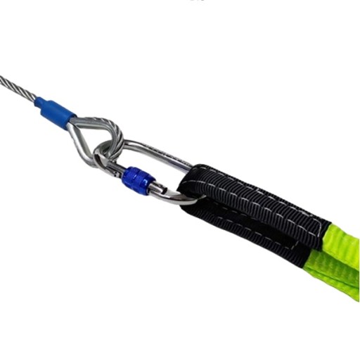 UWAGA! Nigdy nie łącz stalowej liny bezpośrednio z taśmą napinającą, może to doprowadzić do uszkodzenia taśmy i zerwania zaczepu. Zawsze pamiętaj o połączeniu taśmy i liny za pomocą profesjonalnego karabińczyka o dużej wytrzymałości(2500kg) dołączonego do zestawu.