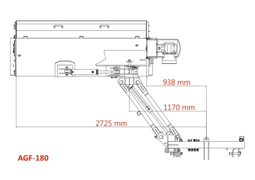 Model AGF-180 ma szerokość koszenia 180 cm i jest napędzany wałkiem WOM wchodzącym w zakres dostawy. Kosiarka może być przesuwana w lewo i w prawo oraz pochylana (w górę o 90° i w dół o 55°). Do obsługi tych funkcji potrzebne są 2 obwody sterowania hydraulicznego w ciągniku, ponieważ kosiarka jest wyposażona w 2 siłowniki hydrauliczne dwustronnego działania.
