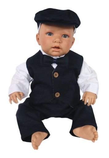 - Kamizelka: kolor granatowa z guzikami karmelowymi uszyta na bawełnie.