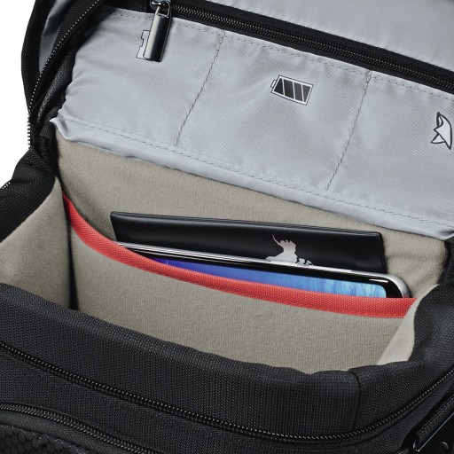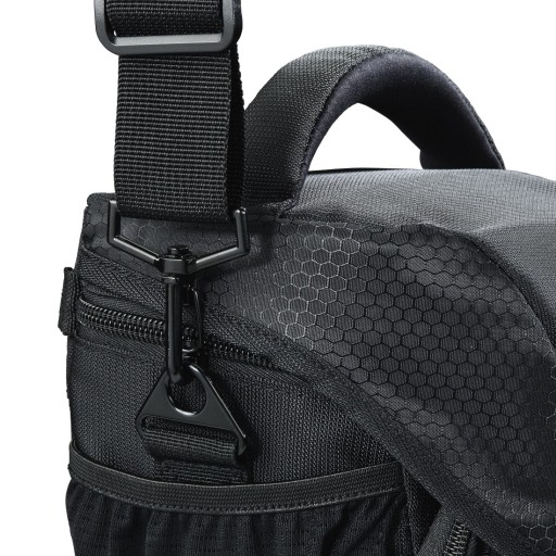 Torba posiada główną komorę wyściełaną miękkim materiałem, który chroni aparat przed uszkodzeniem. Podwójne zamykanie: na klamrę oraz zamek błyskawiczny dodatkowo zabezpiecza sprzęt przed przypadkowym wypadnięciem. Pod pokrywą znajduje się kieszonka na baterie lub karty pamięci, natomiast wewnątrz głównej komory jest jeszcze dodatkowa płaska przegródka na dokumenty. Ponadto z przodu torby znajduje się dodatkowa niewielka komora z organizerem. Na bokach torby umieszczono jeszcze 2 kieszenie z siatki, a pod nimi elastycznie regulowane pasy do mocowania statywu.