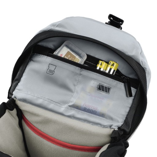 Kobura do przechowywania wyposażenia i do ochrony przed brudem i zadrapaniami cyfrowych lustrzanek z obiektywem. Główna kieszeń z podwójnym zamkiem błyskawicznym. Płaska przednia kieszeń z 2 kieszonkami z siatki, np. na baterie. Dodatkowa zamykana na zamek kieszeń pod klapą, np. na karty pamięci. Wewnętrzna kieszeń z tyłu torby. 2 zewnętrzne kieszenie z siatki po bokach. Elastycznie regulowane uchwyty do statywu pod bocznymi kieszeniami z siatki. 1 wyjmowana wyściółka wewnętrzna do indywidualnej regulacji rozmiaru. 2 szlufki na pasek. Odpinany i regulowany pasek na ramię z ergonomicznie dopasowaną wyściółką na ramię. Wyściełany uchwyt do przenoszenia. Podstawa z możliwością mycia. Osłona przeciwdeszczowa zintegrowana na dole tylnej części z zapięciem na rzep.