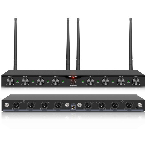 Ośmiokanałowy zestaw mikrofonów bezprzewodowych Shudder SDR1083 UHF 4 mikrofony doręczne + 4 mikrofony nagłowne z mikroportem
