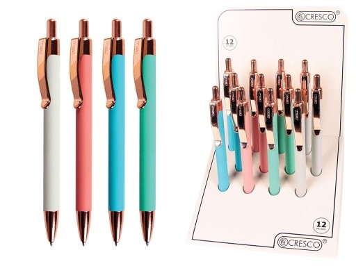 Opakowanie zbiorcze zawiera 12 szt. w miksie kolorystycznym. Model długopisu MASTER w wyjątkowej kolorystyce ze złotym wykończeniem. Długopis posiada pstrykany system wysuwania wkładu wielkopojemnościowego typu Zenith.