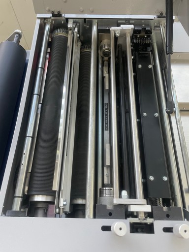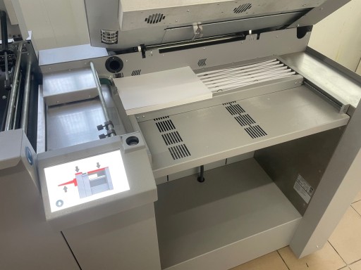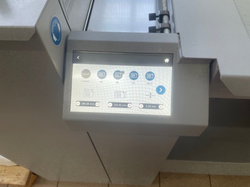 Narząd maszyny to kilka sekund. Jeśli nie wybieramy zapisanego wcześniej programu a tworzymy nowy to wystarczy wybrać na wyświetlaczu jeden z łamów oraz podać wymiary arkusza. Maszyna automatycznie ustawi odległości wałków, bigów, falcu, dostosuje moc rozdmuchu, podciśnienia oraz ustawi stół podający i odbierający.