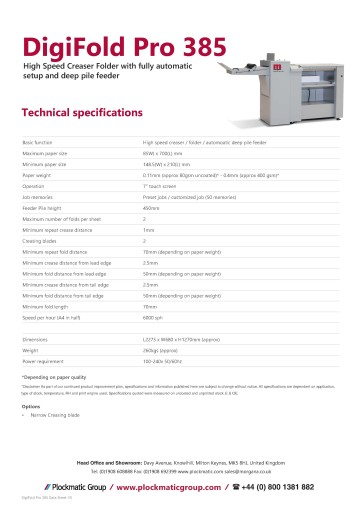 DigiFold Pro 385 to najnowsza propozycja Morgany jest wyposażony w technologię umożliwiającą automatyczne konfigurowanie zadań, w tym ustawianie wszystkich funkcji podajnika, rolek, noży poprzez wybór zaledwie kilku prostych parametrów na ekranie dotykowym Morgana SmartScreen. Nowy podajnik wysokiego stosu umożliwia układanie w stosy do 450mm.