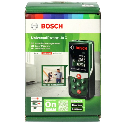 Dalmierz firmy BOSCH model UniversalDistance 40C przeznaczony do szybkich, łatwych i co ważne, bardzo dokładnych pomiarów przy pomocy promienia laserowego. Za naciśnięciem przycisku mierzy długości, powierzchnie i kubatury, a wynik pomiaru ukazuje się na dużym, ciekłokrystalicznym wyświetlaczu dalmierza.