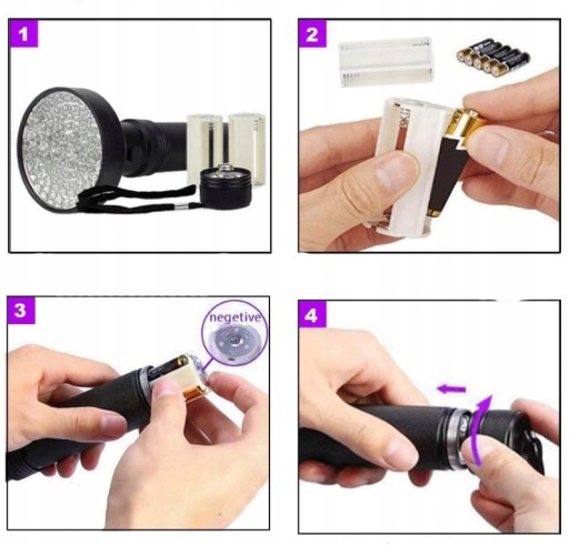 - Latarka UV ze 100 diodami LED emituje światło UV o długości 395 nm, aby podkreślić sole w zaschniętym moczu i nadać połysk, dzięki czemu plamy będą widoczne dla ludzkiego oka.