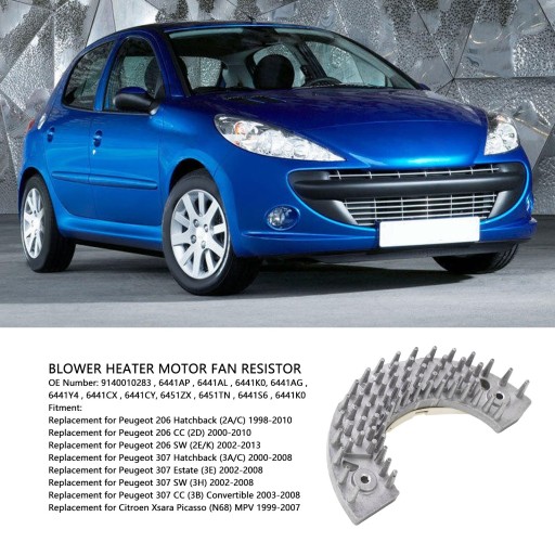 Funkcja:1. Dotyczy modeli: Rezystor wentylatora silnika nagrzewnicy dmuchawy zastępuje Peugeot 206 Hatchback (2A/C) i zastępuje Citroen Xsara Picasso (N68) MPV.