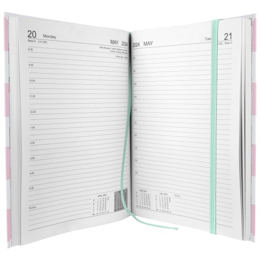 Wyklejka okładki dziennika ozdobiona jest głównym motywem. Pierwsza strona posiada miejsce na dane kontaktowe. Wnętrze zawiera wiele sekcji, które pomogą Ci bardzo dobrze się zorganizować, takich jak: miesięczne plany, harmonogramy, strony na adresy i kontakty oraz miejsce na notatki.
