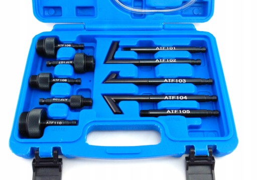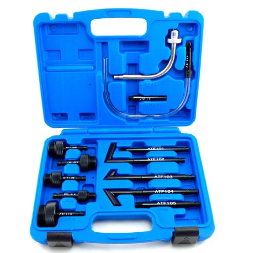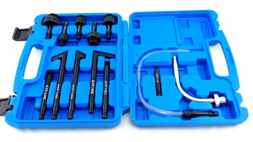 Zestaw adapterów do wymiany i nalewania oleju do automatycznych skrzyni biegów. Pasują do większości samochodów na rynku.