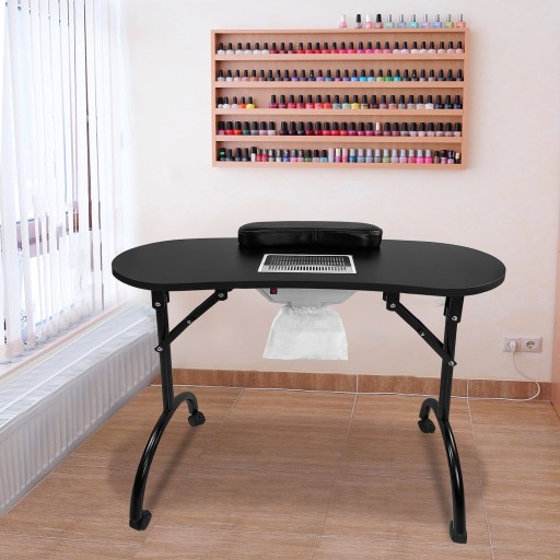 Składany stół do manicure: wymiary: 90 x 37 x 77 cm; wymiary po złożeniu: 90 x 37 x 18 cm; moc ssania: 4500 obr./min; zużycie prądu: 17 W; poziom ciśnienia akustycznego: 55 dB. Przestronny blat stołu zapewnia dużo miejsca.
