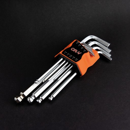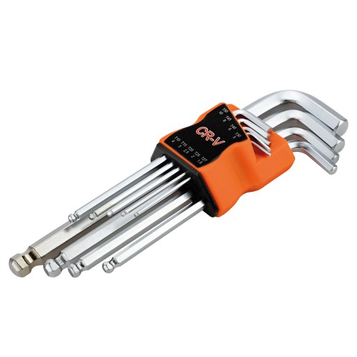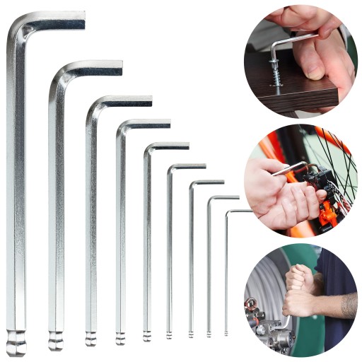 Taka budowa ułatwia przykręcanie ze względu na możliwość manewrowania długością narzędzia w trudno dostępnych miejscach. Klucze sprawdzą się doskonale do prostych prac montażowych, tworzenia trwałych połączeń pomiędzy różnymi elementami, skręcania mebli oraz napraw sprzętów sportowych np. rowerów czy rolek. W zestawie znajduje się 9 kluczy o rozmiarach od 1,5 do 10 mm. Klucze wykonane są z wysokiej jakości stali chromowo-wanadowej – czyni je to bardzo trwałymi, odpornymi na uszkodzenia mechaniczne oraz wyginanie. Zapakowane w wygodny uchwyt z tworzywa sztucznego z przygotowanymi odpowiednimi miejscami na każdy klucz. Pozwala to na utrzymanie porządku i kontroli ilości kluczy. Dodatkowo końce kluczy zakończone są kulką, która umożliwia stosowanie kluczy pod kątem nachylenia do 25°.