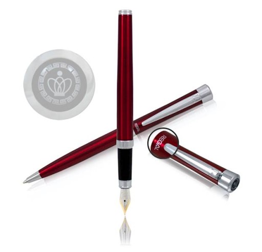 Elegancki komplet "Katherine " w kolorze czerwonym zawierający pióro ze srebrno - złotą stalówką (1,8 x 0,8 cm), ozdobioną grawerem z emblematem marki Regal.