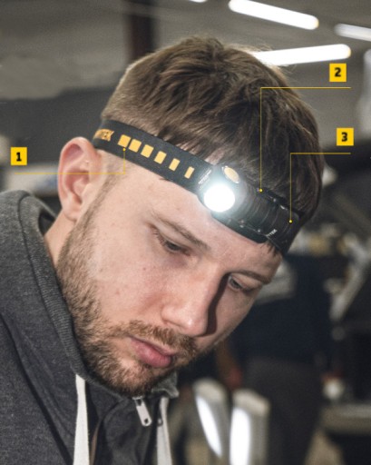 1️⃣ Wygodne mocowanie na czoło, miękka elastyczna gumka, regulowany rozmiar.