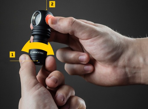 1️⃣ Wybór między dwoma trybami - Odkręć tylną zakrętkę wyłączonej latarki o 1/4, naciśnij przycisk i trzymając wciśnięty, zakręć zakrętkę.