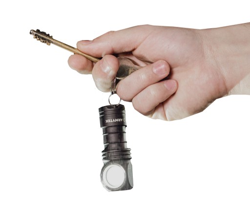 - Odkręć tylną zakrętkę wyłączonej latarki o 1/4, naciśnij przycisk i trzymając wciśnięty, zakręć zakrętkę.