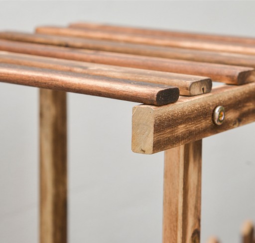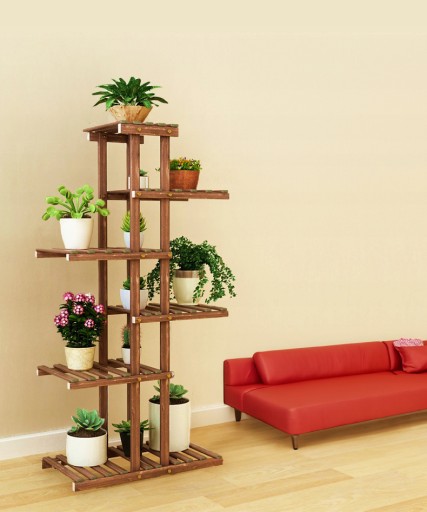 Solidna konstrukcja z naturalnego drewna zapewnia nie tylko trwałość, ale również estetyczny wygląd, który doskonale komponuje się z otaczającą roślinność. Wielopoziomowy design tego stojaka na kwiaty pozwala na stworzenie unikalnych kompozycji, tworząc wrażenie piętrzącej się zieleni i wprowadzając dynamiczny element do Twojego ogrodu.