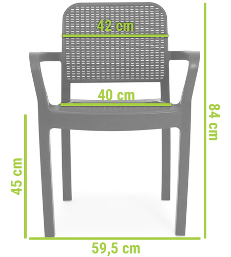 Meble tarasowe wykonane są w całości z wysokiej jakości polipropylenu. Jest to tworzywo sztuczne o dużej odporności na wodę, promieniowanie UV i niekorzystne oddziaływanie warunków atmosferycznych.