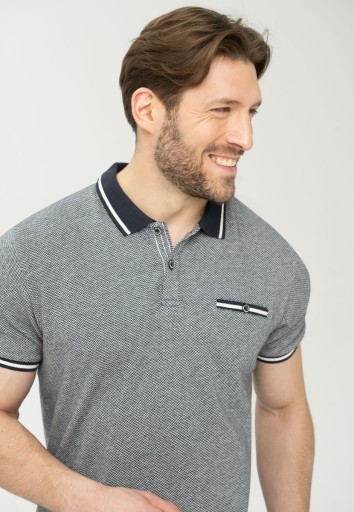 Charakterystyczną cechą koszulki polo T-WERTO jest jej materiał. To 100 % bawełna, która w dotyku przypomina miękki, lekki sweter. Nasi projektanci umieścili na niej wzór w jodełkę, który jest widoczny na całej powierzchni tej granatowej męskiej polówki. Koszulka polo ma prosty, ale elegancki fason z krótkim rękawem i kołnierzykiem, który jest zapinany na trzy guziki. Granatowy kolor przełamany jasnym wzorem będzie bardzo dobrze komponował się z większością męskiej garderoby. Możesz go połączyć z czarnymi jeansami, beżowymi chinosami czy nawet niebieskimi szortami z jeansu. To samo dotyczy górnych części garderoby.