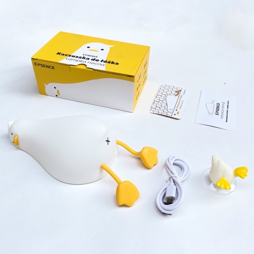 Kaczuszka do łóżka została wykonana z nietoksycznego sylikonu aby zapewnić bezpieczeństwo. Jest wodoodporna oraz odporna na upadki. Część sylikonowa łatwo się odłącza bez uszkodzenia lampy, co zabezpieczy lampkę przez uszkodzeniem je przez dziecko.