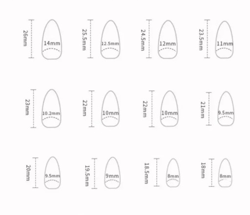 - tipsy 24 sztuki w 12 różnych rozmiarach - bez względu na rozmiar paznokcia, możesz wybrać najbardziej odpowiedni dla siebie sztuczny paznokieć.